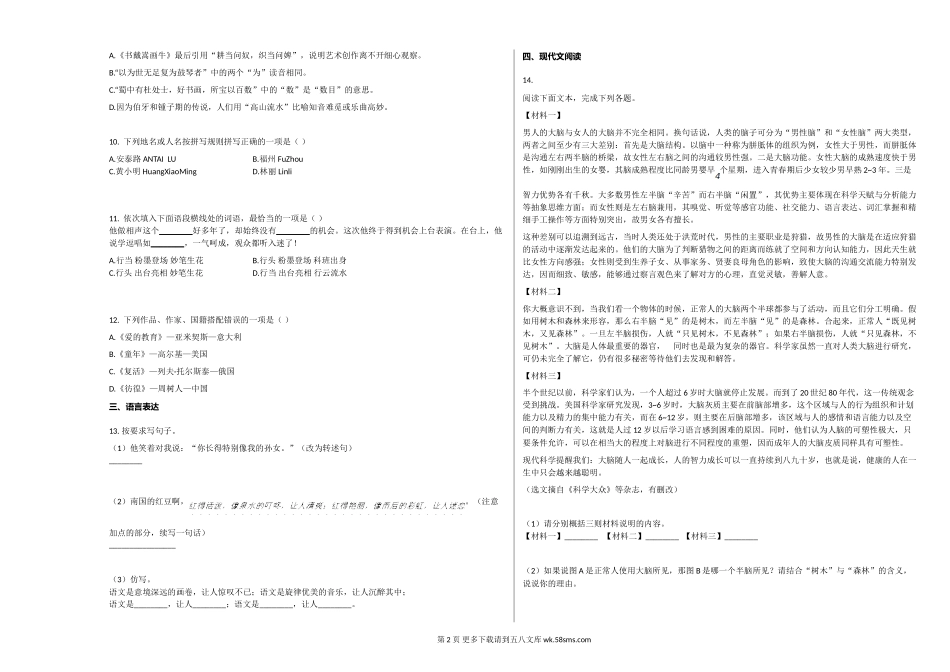福州市2020-2021学年第一学期六年级语文期末模拟试卷.doc_第2页