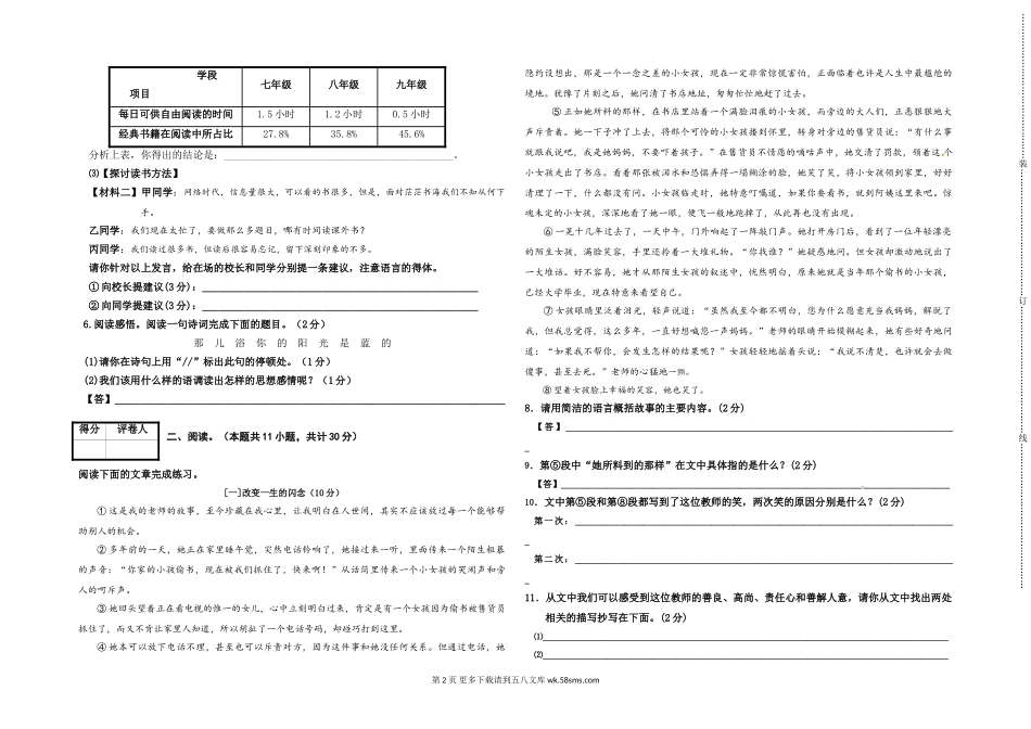 七年级期末质量评价语文试卷【注意事项】1.本试卷共三大题,考试时间为120分钟,试卷满分为100分。2.请用答题卡,在试卷或者草稿纸上答题无效,考试结束试卷及答题卡一并交回。题号一二三总分得分一、语文积累与...