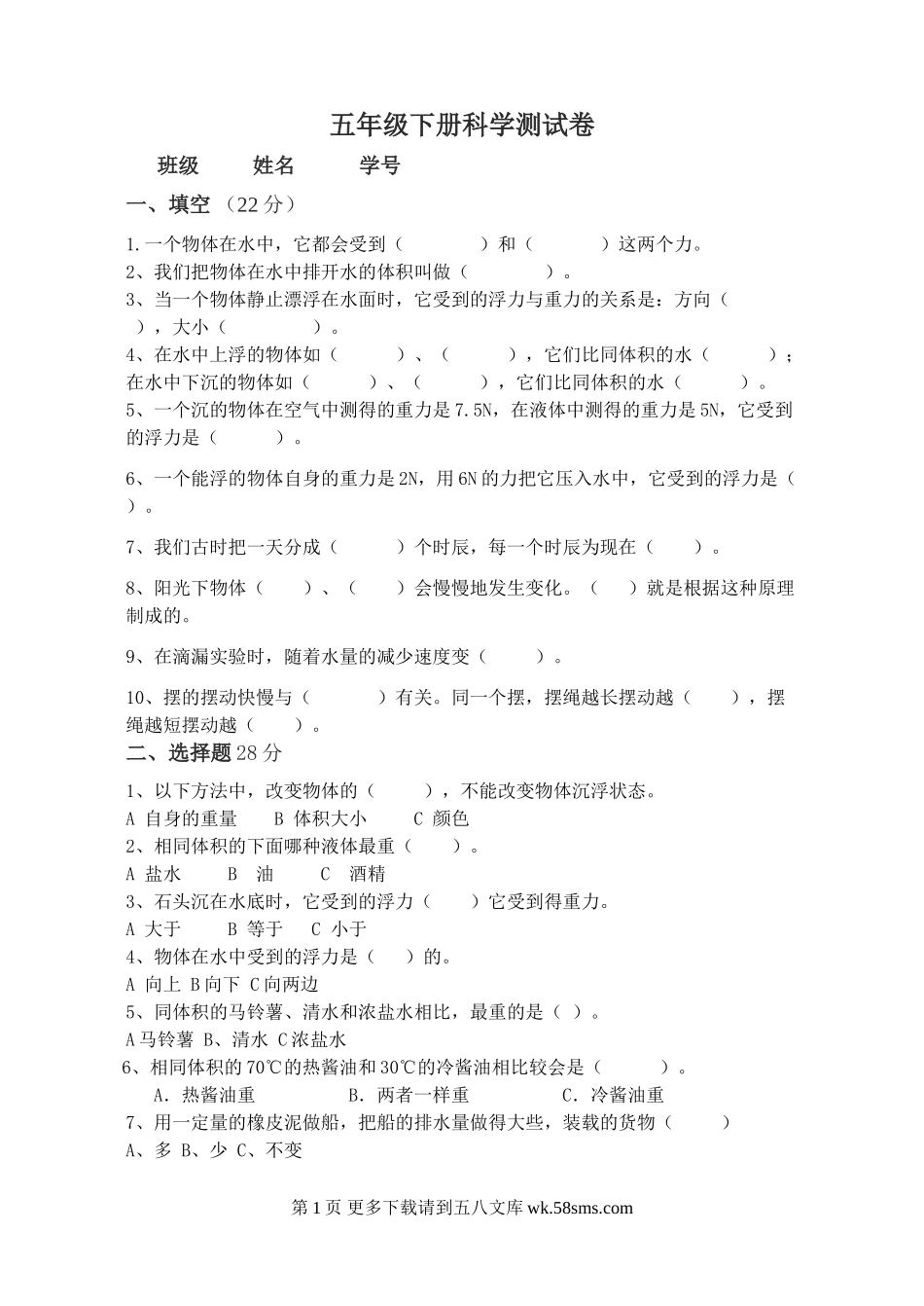 五年级下册科学测试卷班级姓名学号一、填空(22分)1.一个物体在水中,它都会受到()和()这两个力。2、我们把物体在水中排开水的体积叫做()。3、当一个物体静止漂浮在水面时,它受到的浮力与重力的关系是:...