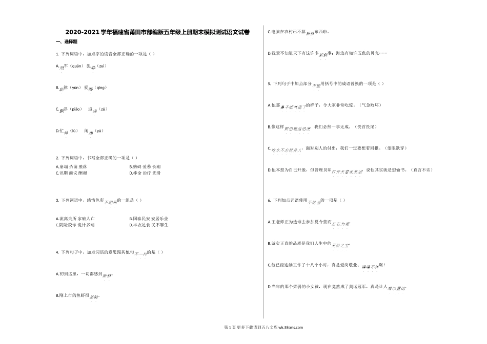 莆田市2020-2021学年第一学期五年级语文期末模拟试卷.doc_第1页