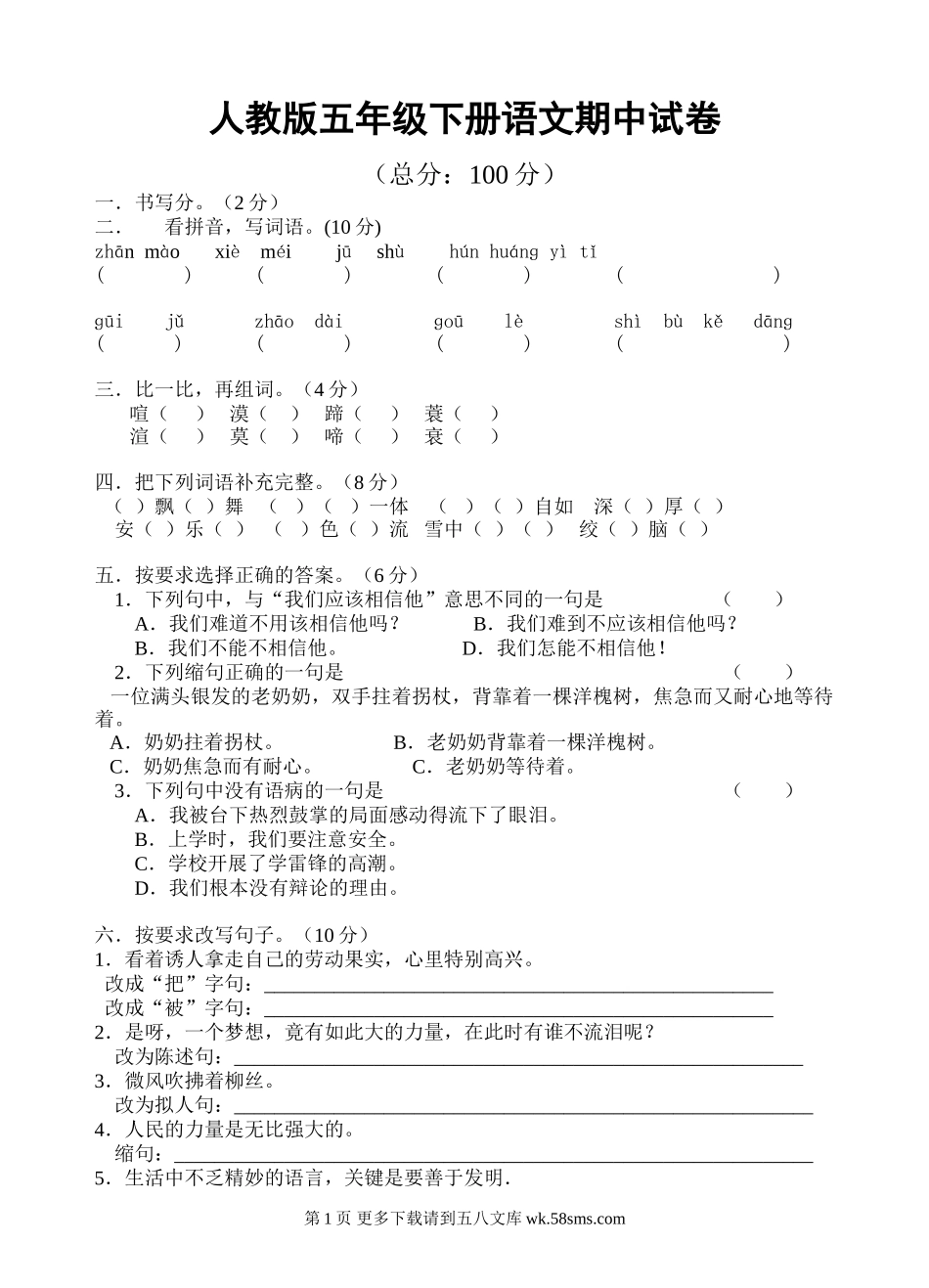 人教版五年级下册语文期中试卷(总分:100分)一.书写分。(2分)二.看拼音,写词语。(10分)zhānmàoxièméijūshùhúnhuánɡyìtǐ()()()()ɡūijǔzhāodàiɡoūlèshìbùkědānɡ()()()()三.比一比...