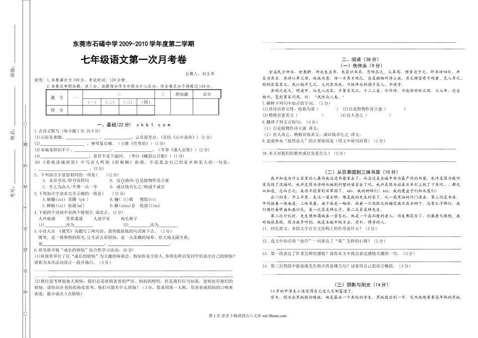 东莞市石碣中学2009-2010学年度第二学期七年级语文第一次月考卷出题人:刘玉华说明:1.本卷满分为100分,考试时间:120分钟。2.本卷设有附加题,共5分,该题得分作为补偿分计入总分,但全卷总分不得超过100分。题...