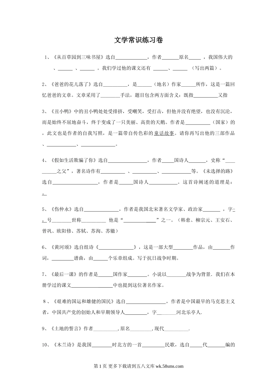 文学常识练习卷1、《从百草园到三味书屋》选自,作者原名,我国伟大的、、。我们学过他的课文还有、(写出两篇)。2、《爸爸的花儿落了》选自_____,是___(地名)作家___所作,这是一篇回忆爸爸的文...