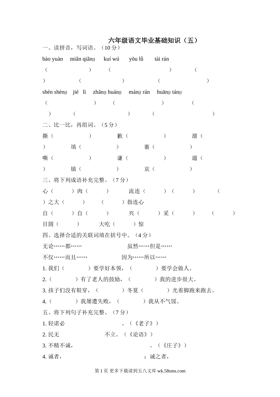 六年级语文毕业基础知识(五)一、读拼音,写词语。(10分)bàoyuànmiǎnqiǎnɡkuíwúyōulǜtàirán()()()()()shénshènɡjiélìzhānɡhuánɡmánɡránhuānɡtánɡ()()()()()二...