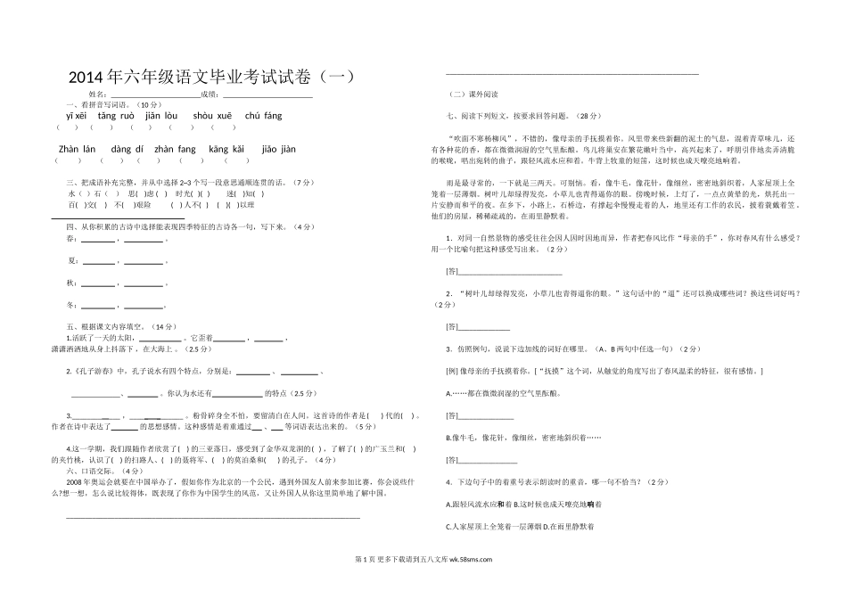 2014年六年级语文毕业考试试卷(一)姓名:成绩:一、看拼音写词语。(10分)yīxēitǎngruòjiǎnlòushòuxuēchúfáng()()()()()Zhànlándàngdízhànfangkāngkǎijiǎojiàn()()()()...