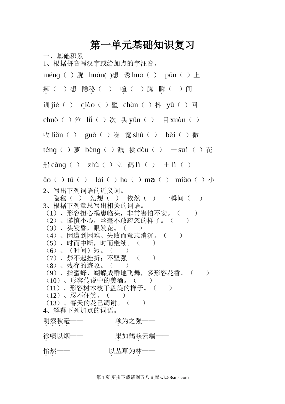 第一单元基础知识复习一、基础积累1、根据拼音写汉字或给加点的字注音。ménɡ()胧huàn()想诱huò()pān()上痴()想隐秘()喧()腾瞬()间训jiè()qiào()壁chàn()抖yū()回chuò()泣lǚ(...