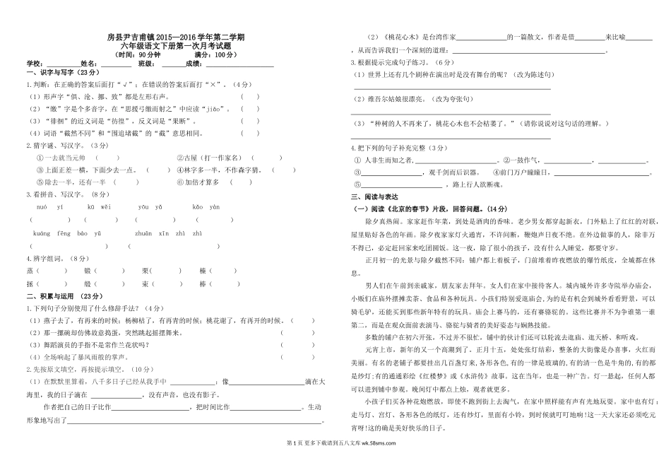 房县尹吉甫镇2015—2016学年第二学期六年级语文下册第一次月考试题(时间:90分钟满分:100分)学校:姓名:班级:成绩:一、识字与写字(23分)1.判断:在正确的答案后面打“√”;在错误的答案后面打“×”。(...