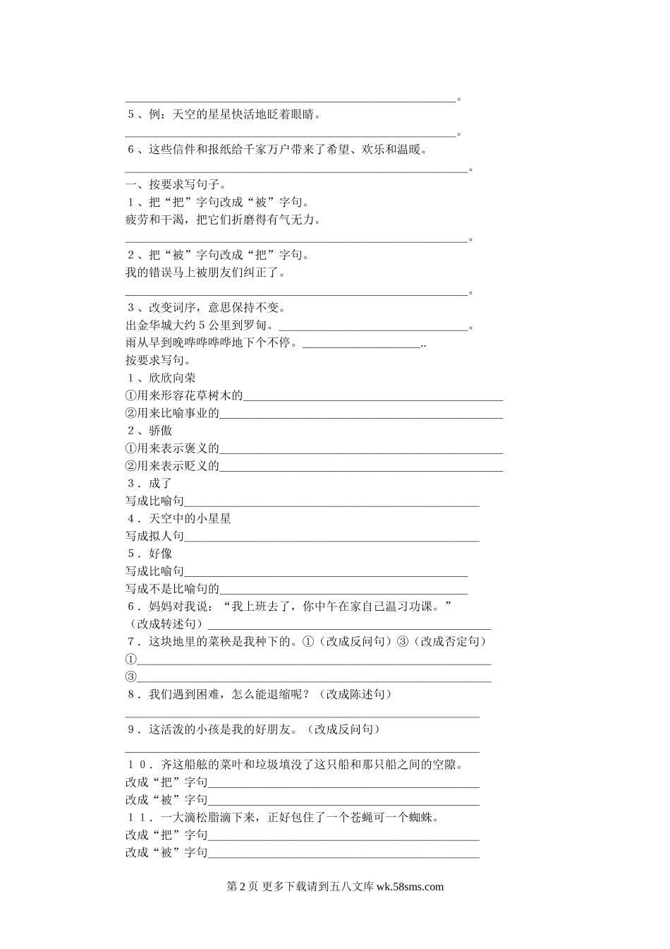 一、按要求写句子。1、把“把”字句改成“被”字句。疲劳和干渴,把它们折磨得有气无力。_____________________________。2、把“被”字句改成“把”字句。我的错误马上被朋友们...