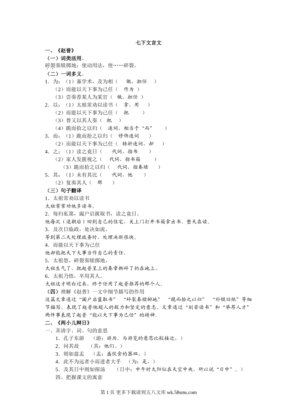 七下文言文一、《赵普》(一)词类活用。碎裂奏牍掷地:使动用法,使……碎裂。(二)一词多义。1.为:(1)寡学术,及为相(做,担任)(2)而能以天下事为己任(作为)(3)尝奏荐某人为某官(做,担任)2.以...