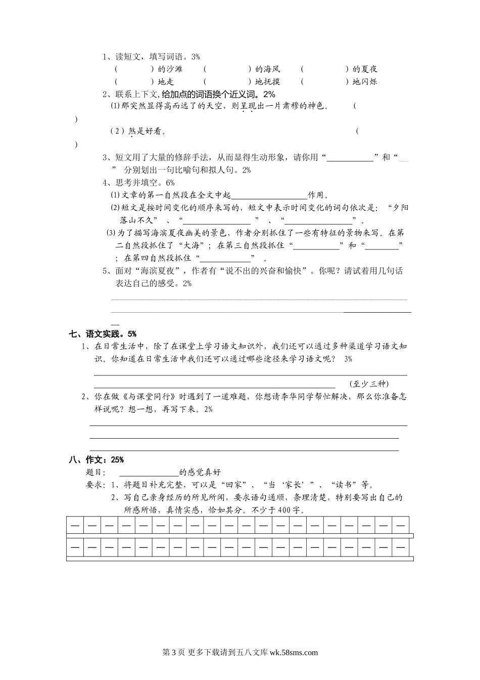苏教版五年级语文下册第一单元试卷.doc_第3页