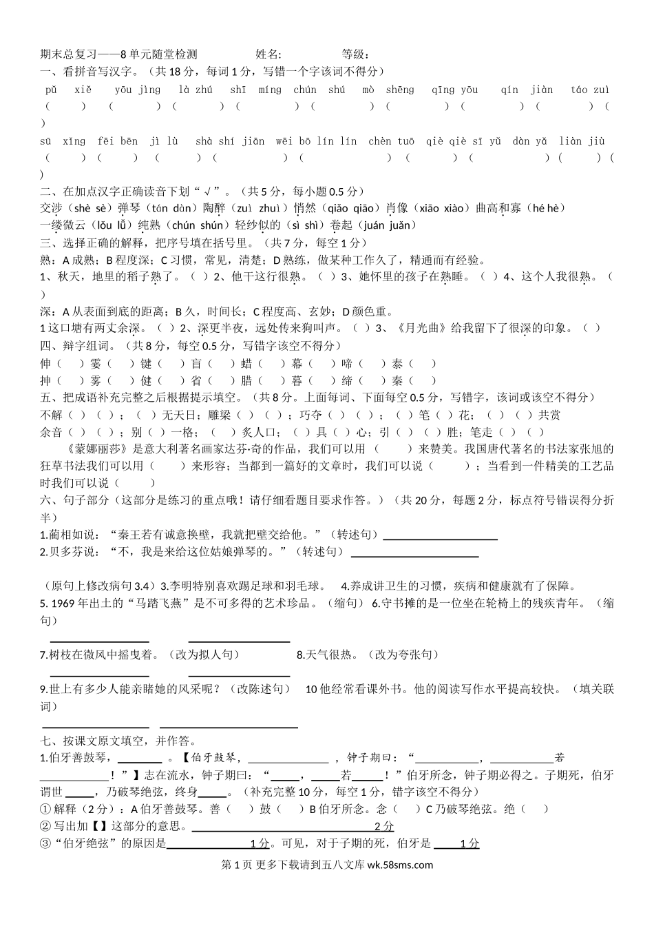 期末总复习——8单元随堂检测姓名:等级:一、看拼音写汉字。(共18分,每词1分,写错一个字该词不得分)pǔxiěyōujìnɡlàzhúshīmínɡchúnshúmòshēnɡqīnɡyōuqínjiàntáozuì()()()()()...