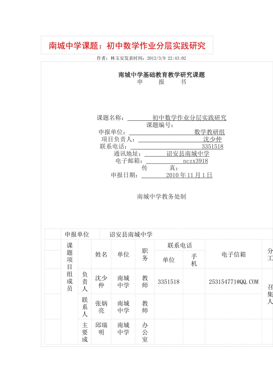 南城中学课题:初中数学作业分层实践研究作者:林玉安发表时间:2012/3/922:43:02南城中学基础教育教学研究课题申报书课题名称:初中数学作业分层实践研究课题编号:申报单位:数学教研组项目负责人:沈少仲联系...