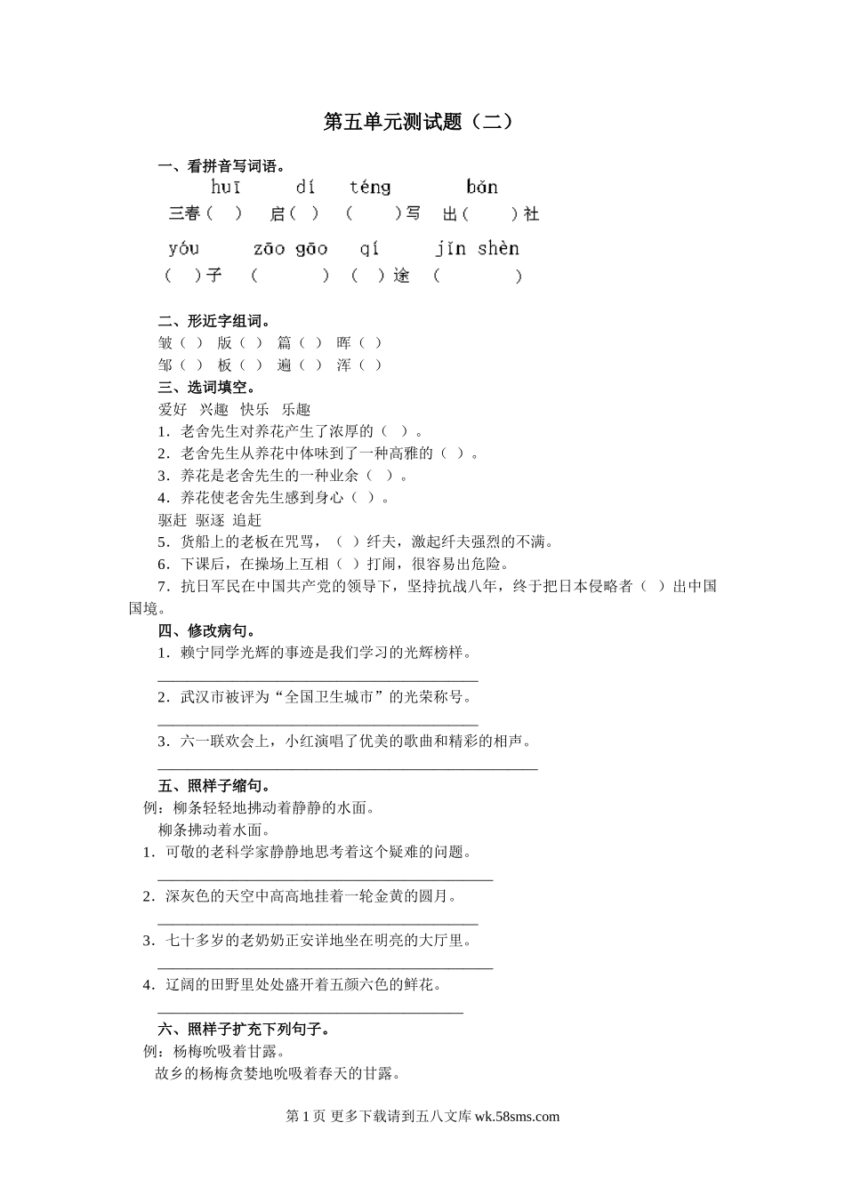 第五单元测试题(二)一、看拼音写词语。二、形近字组词。皱()版()篇()晖()邹()板()遍()浑()三、选词填空。爱好兴趣快乐乐趣1.老舍先生对养花产生了浓厚的()。2.老舍先生从养花中体味到了一...