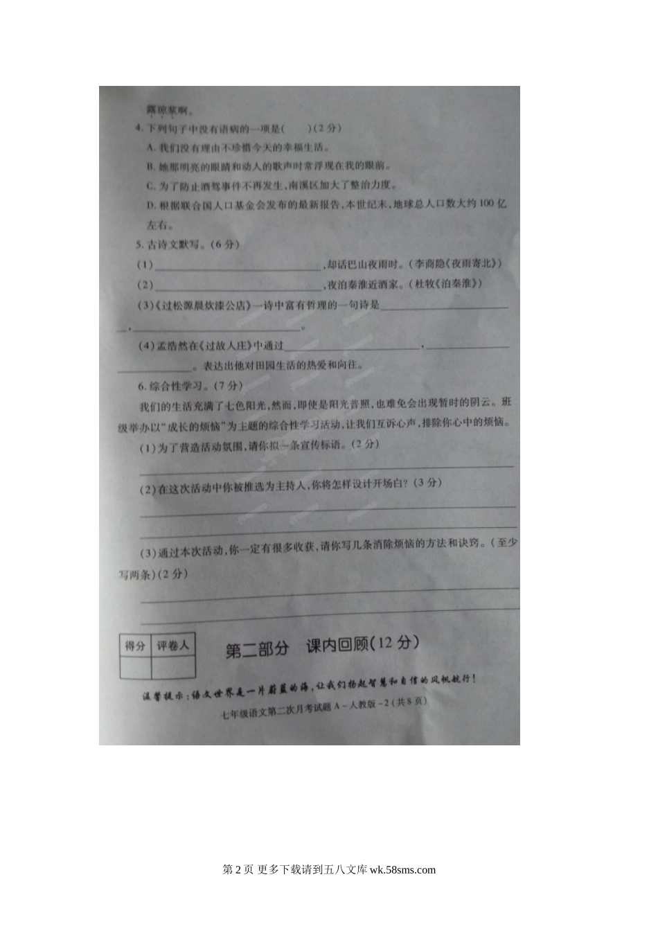 旬阳县桐木中学七年级12月月考语文试题及答案.doc_第2页