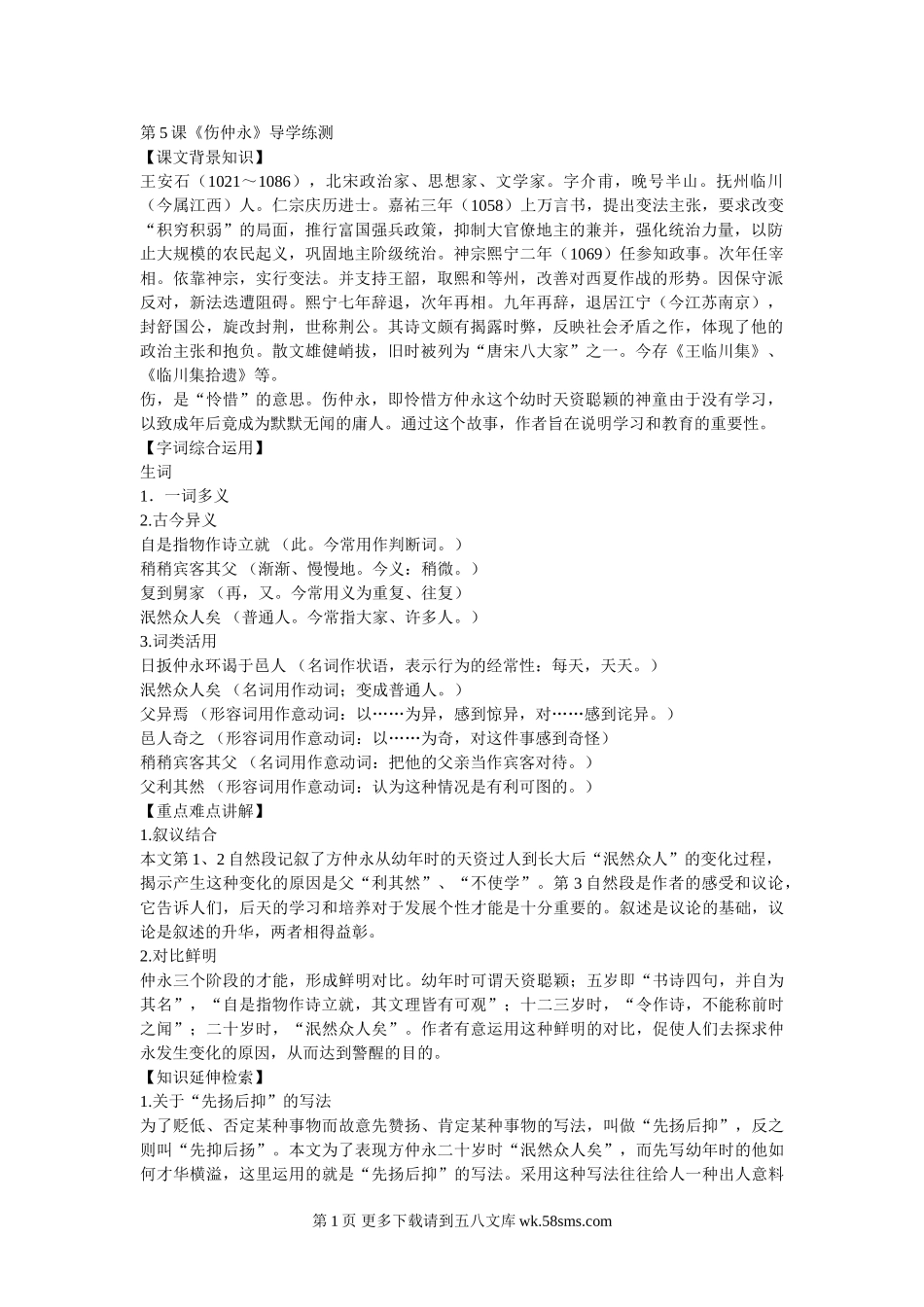 第5课《伤仲永》导学练测【课文背景知识】王安石(1021~1086),北宋政治家、思想家、文学家。字介甫,晚号半山。抚州临川(今属江西)人。仁宗庆历进士。嘉祐三年(1058)上万言书,提出变法主张,要求改变“积...