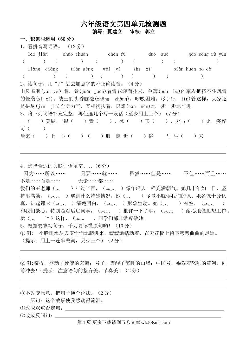 六年级语文第四单元检测题编写:夏建立审核:郭立一、积累与运用(60分)1、看拼音写词语。(12分)lǎojiǎnchūochuānchānfúduōsuōgāosǒngrùyún()()()()()liàngqiàngtiángěngwēiyízh...