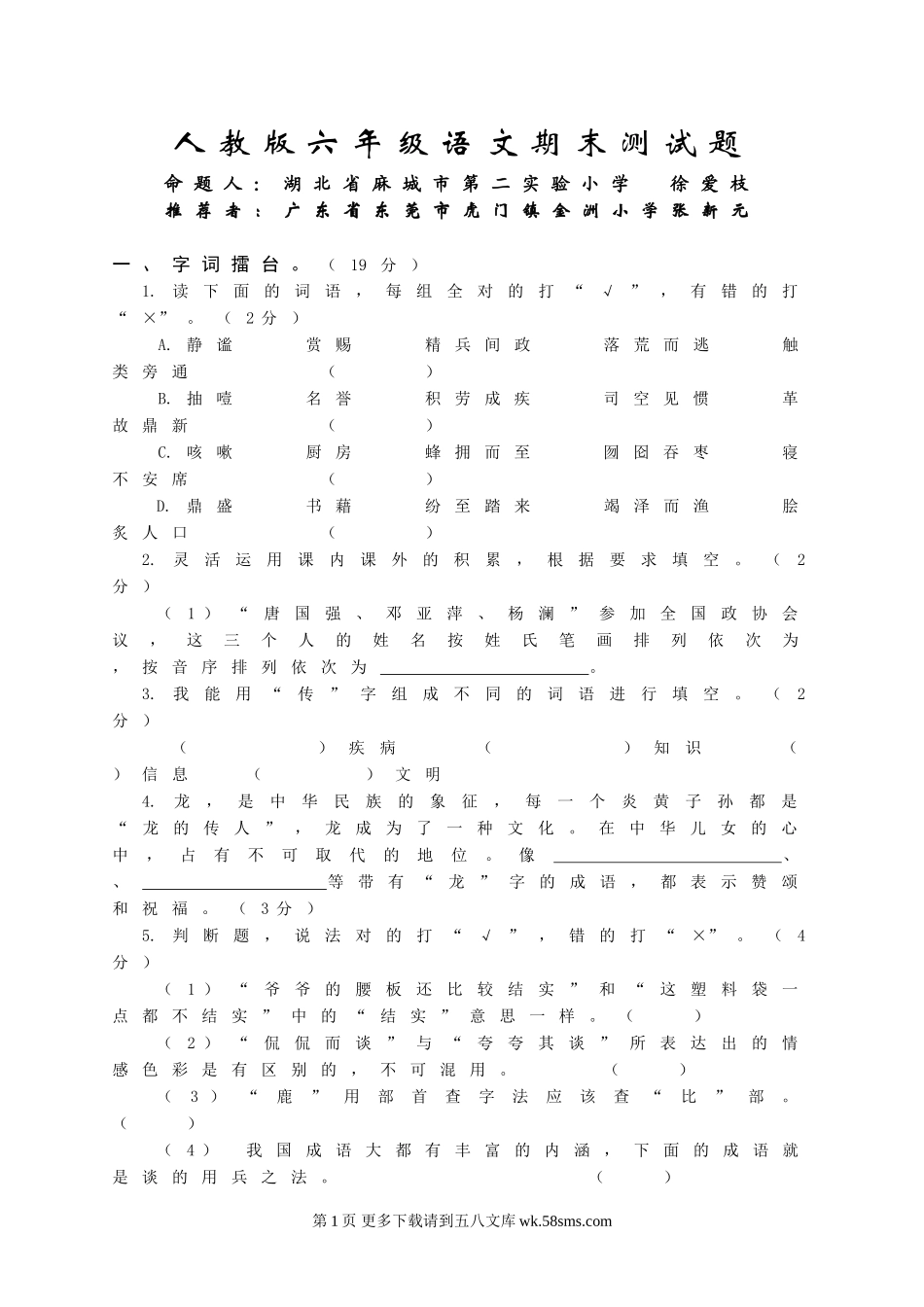 人教版六年级语文期末测试题命题人:湖北省麻城市第二实验小学徐爱枝推荐者:广东省东莞市虎门镇金洲小学张新元一、字词擂台。(19分)1.读下面的词语,每组全对的打“√”,有错的打“×”。(2分)A.静谧赏赐精...