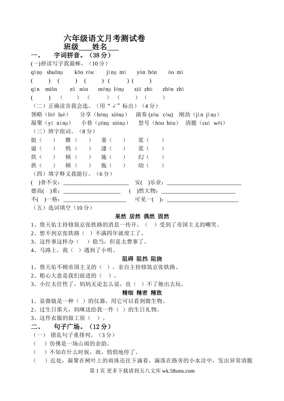 六年级语文月考测试卷班级姓名一、字词拼音。(38分)(一)拼读写字我最棒,(10分)qīnɡshuǎnɡkǎoròujìnɡmìyùnhánàomì()()()()()qínmiǎnzǔnáoménɡlónɡxiūzhùzhēnzhì()()()()()...
