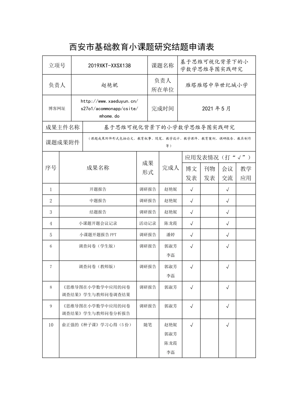 西安市基础教育小课题研究结题申请表立项号2019XKT-XXSX138课题名称基于思维可视化背景下的小学数学思维导图实践研究负责人赵艳妮负责人所在单位雁塔雁塔中华世纪城小学博客网址http://www.xaeduyun.cn/s27o1/aco...