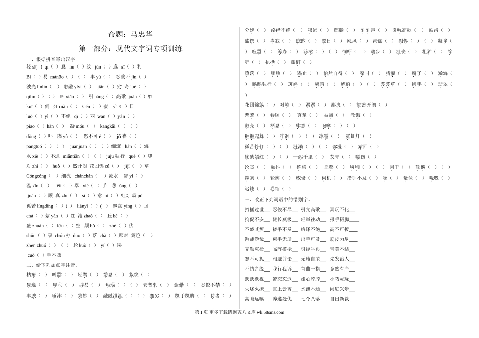 命题:马忠华第一部分:现代文字词专项训练一、根据拼音写出汉字。轻sī()qì()息hú()纹jùn()逸xī()利Bì()易mánǎo()()丰yú()忍俊不jīn()波光línlín()融融yìyì()jiǎn()劣奇j...