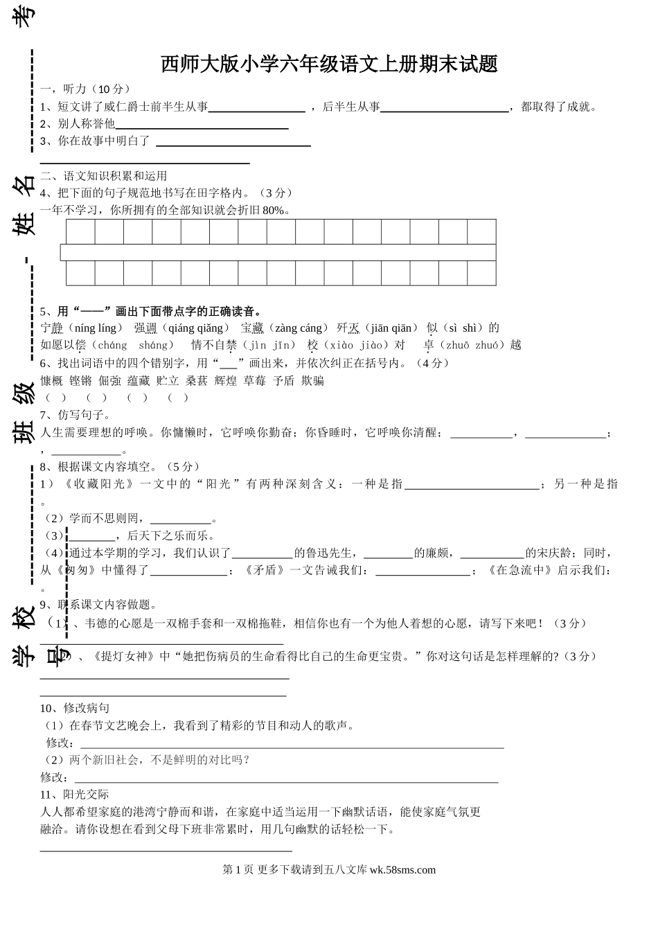 学校---------------班级-------------姓名-------------考号--------------西师大版小学六年级语文上册期末试题一,听力(10分)1、短文讲了威仁爵士前半生从事,后半生从事,都取得了成就。2、别人称誉他3、你...