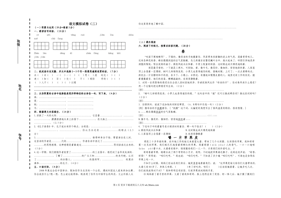 语文模拟试卷(二)(一)积累与运用(39分+卷面3分)一、看拼音写词语。(10分)yīxēitǎngruòjiǎnlòushòuxuēchúfangZhànlándàngdízhànfàngkāngkǎijiǎojiàn二、把成语补充完整,并从中选择2—...