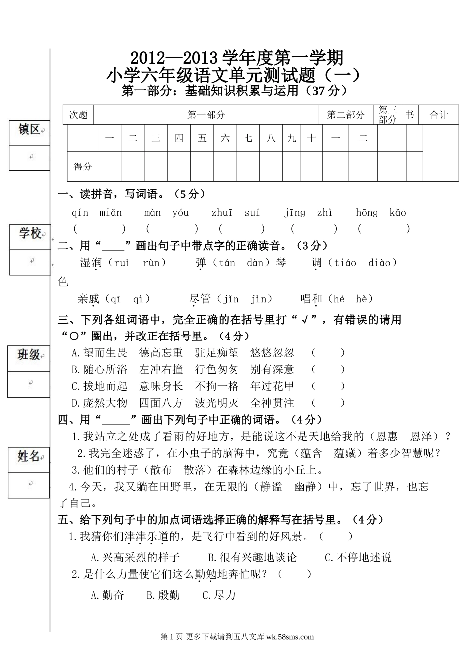 2012—2013学年度第一学期小学六年级语文单元测试题(一)第一部分:基础知识积累与运用(37分)一、读拼音,写词语。(5分)qínmiǎnmànyóuzhuīsuíjīnɡzhìhōnɡkǎo()()()()()二、用“”画出句子中带点...