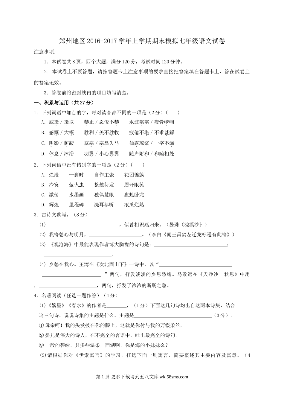 郑州地区2016-2017学年上学期期末模拟七年级语文试卷注意事项:1.本试卷共8页,四个大题,满分120分,考试时间120分钟。2.本试卷上不要答题,请按答题卡上注意事项的要求直接把答案填在答题卡上,答在试卷上的...