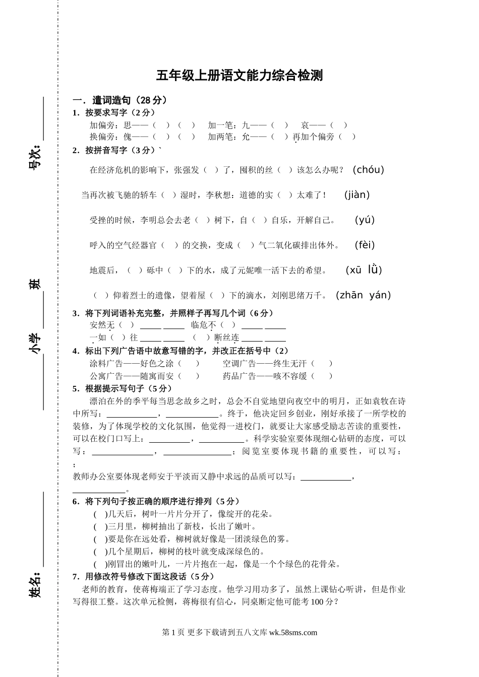 五年级上册语文能力综合检测一.遣词造句(28分)1.按要求写字(2分)加偏旁:思——()()加一笔:九——()哀——()换偏旁:傀——()()加两笔:允——()再加个偏旁()2.按拼音写字(3分)`在经济...