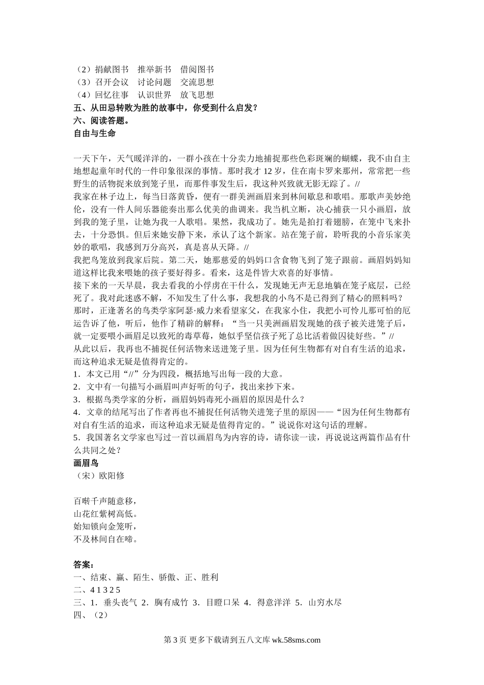 《田忌赛马》习题精选一、写出下列词语的反义词。开始()输()熟悉()谦虚()负()失败()二、按事情发展顺序,重新排列下面几句话。()田忌照孙膑的话,调换了一下马的出场顺序。()田忌和齐威王第一次...