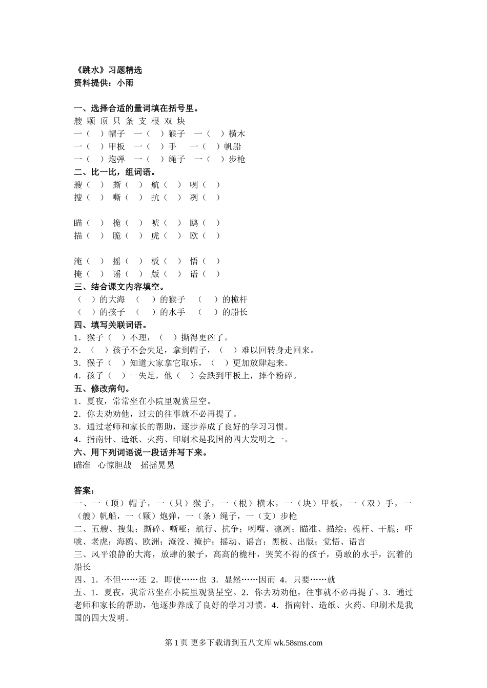 《跳水》习题精选资料提供:小雨一、选择合适的量词填在括号里。艘颗顶只条支根双块一()帽子一()猴子一()横木一()甲板一()手一()帆船一()炮弹一()绳子一()步枪二、比一比,组词语。艘()撕(...
