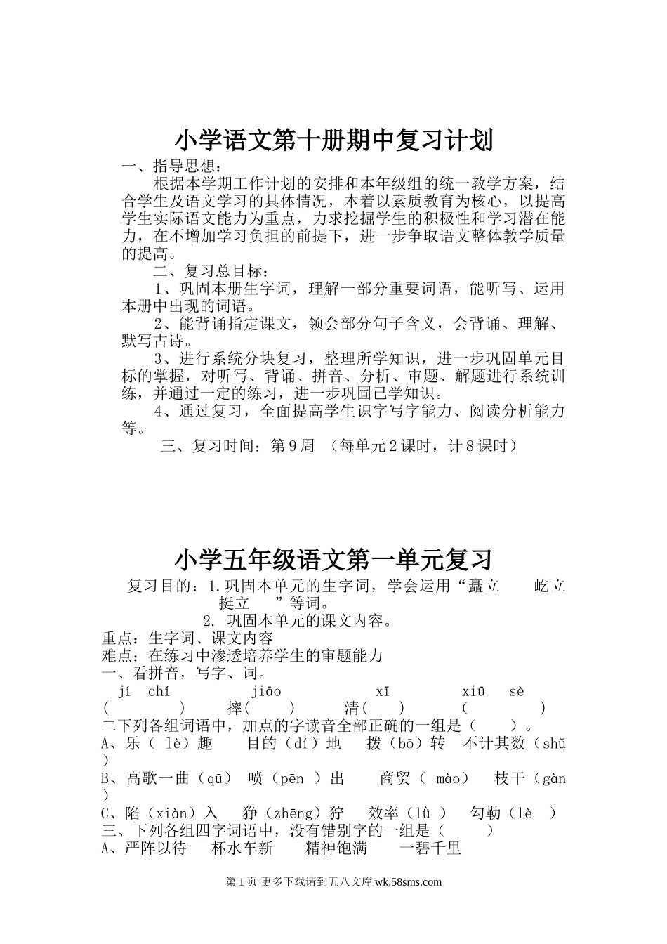 小学语文第十册期中复习计划一、指导思想:根据本学期工作计划的安排和本年级组的统一教学方案,结合学生及语文学习的具体情况,本着以素质教育为核心,以提高学生实际语文能力为重点,力求挖掘学生的积极性和学...