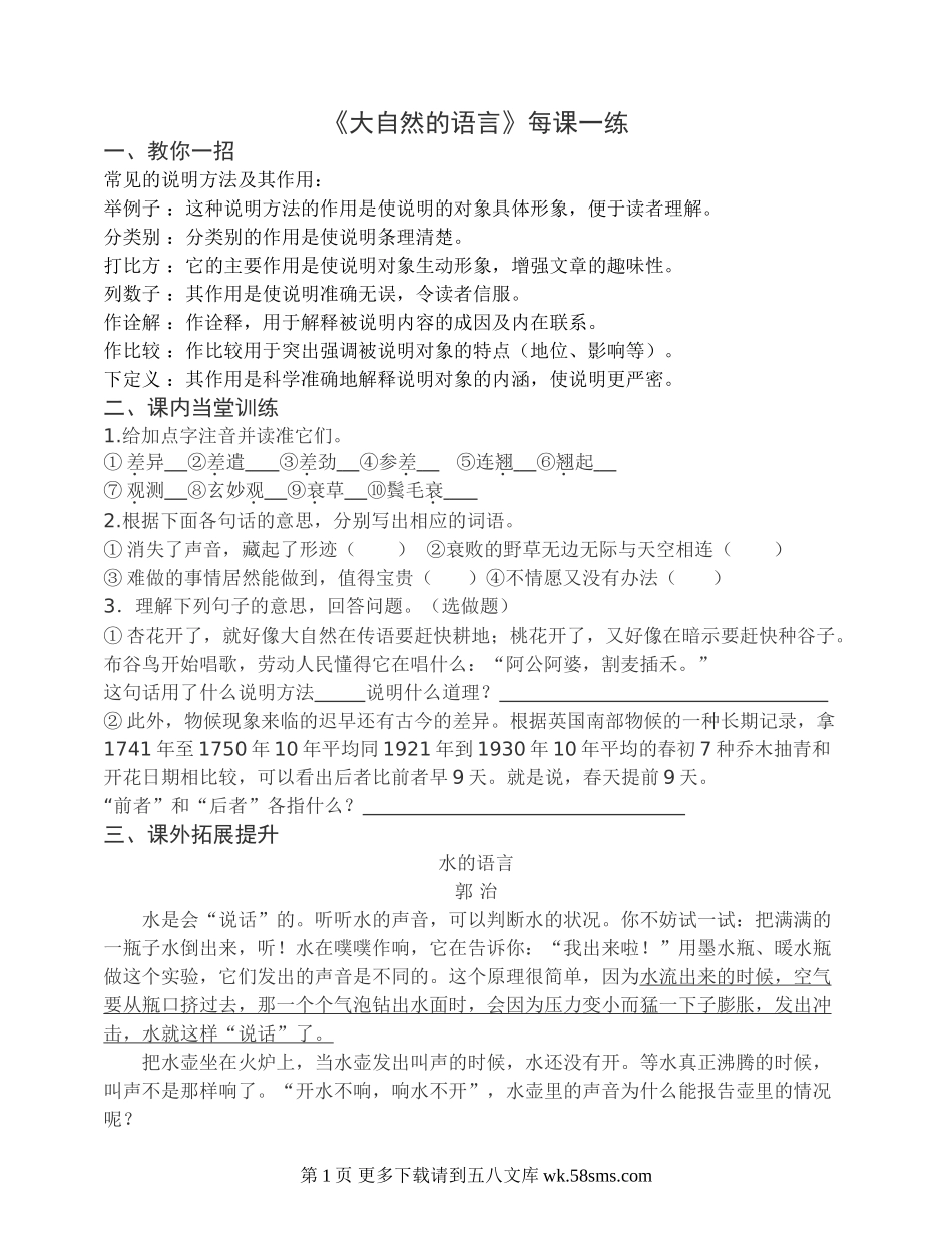《大自然的语言》每课一练一、教你一招常见的说明方法及其作用:举例子:这种说明方法的作用是使说明的对象具体形象,便于读者理解。分类别:分类别的作用是使说明条理清楚。打比方:它的主要作用是使说明对象生...