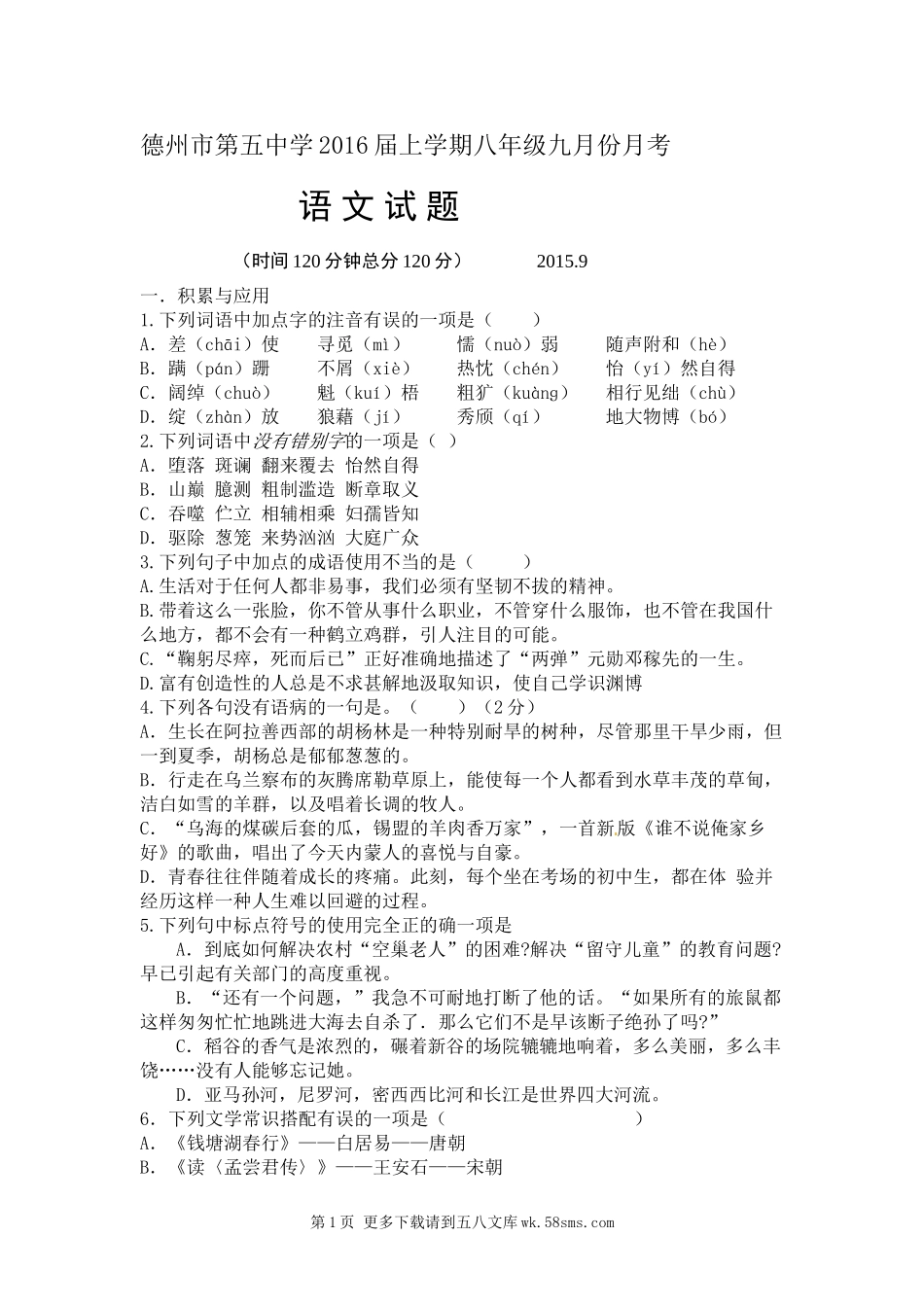 德州五中八年级9月月考语文试卷及答案.doc_第1页
