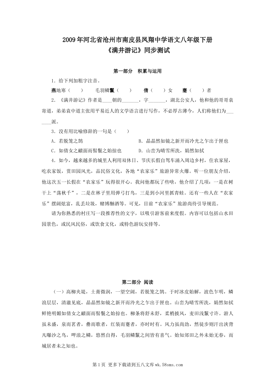 河北省沧州市南皮县凤翔中学2009年八年级下学期同步测试语文试卷-《满井游记》 .doc_第1页