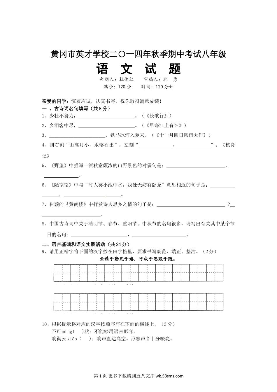 黄冈市英才学校二○一四年秋季期中考试八年级语文试题命题人:杜俊红审稿人:郭勇满分:120分时间:120分钟亲爱的同学:沉着应试,认真书写,祝你取得满意成绩!一、古诗词名句填写(共8分)1、少壮不努力,。(...