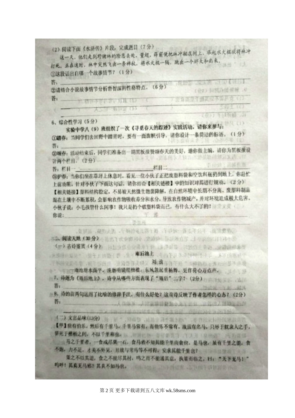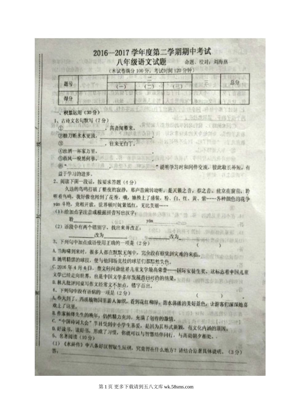 江苏省东台市2016-2017学年第二学期八年级语文期中试卷及答案.doc_第2页