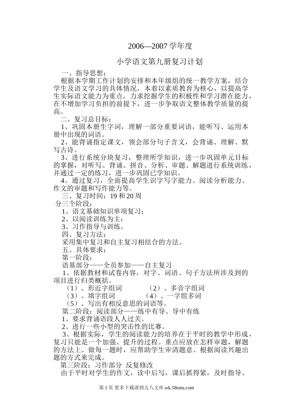 2006—2007学年度小学语文第九册复习计划一、指导思想:根据本学期工作计划的安排和本年级组的统一教学方案,结合学生及语文学习的具体情况,本着以素质教育为核心,以提高学生实际语文能力为重点,力求挖掘学生...