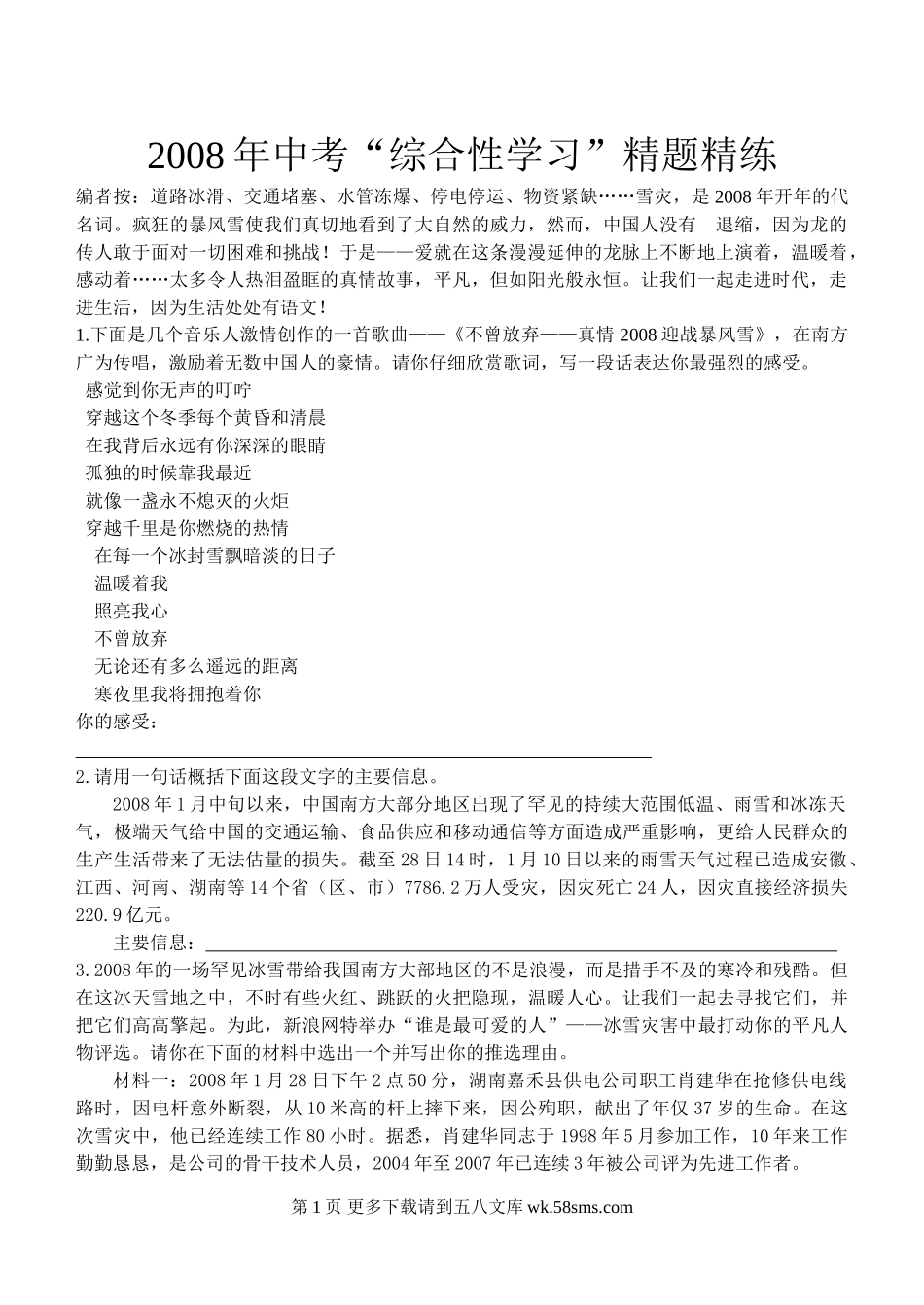 2008年中考“综合性学习”精题精练编者按:道路冰滑、交通堵塞、水管冻爆、停电停运、物资紧缺……雪灾,是2008年开年的代名词。疯狂的暴风雪使我们真切地看到了大自然的威力,然而,中国人没有退缩,因为龙的传...