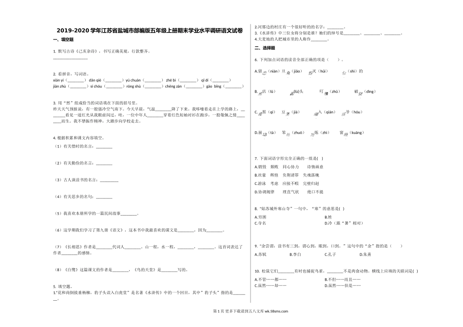 2019-2020学年江苏省盐城市部编版五年级上册期末学业水平调研语文试卷一、填空题1.默写古诗《己亥杂诗》,书写正确美观,行款整齐。_________________2.看拼音,写词语。xiányí(________)dǎnqiè(________...