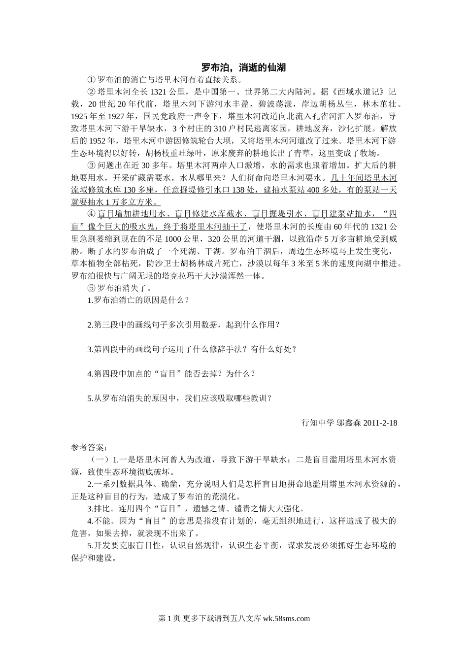 罗布泊,消逝的仙湖课文语段阅读题及答案.doc