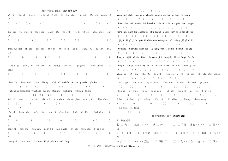 期末分类复习题1:读拼音写汉字wūyánbózīsǎngzīshǒuwǔzúdǒolǜyíngyíngàonǒolǎoshǔguāngtūtū()()()()()()()()dūnxiàchěsangzīdèngyǎnshuāidǎozhuóshítiǎnyītiǎnwánggōnggāoy...