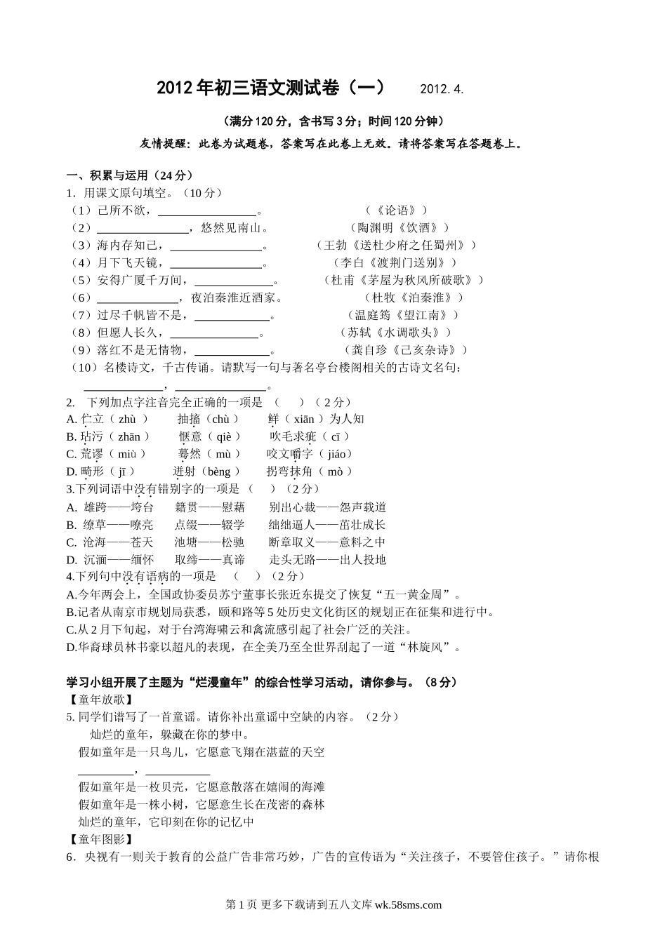 2012年初三语文测试卷(一)2012.4.(满分120分,含书写3分;时间120分钟)友情提醒:此卷为试题卷,答案写在此卷上无效。请将答案写在答题卷上。一、积累与运用(24分)1.用课文原句填空。(10分)(1)己所不...