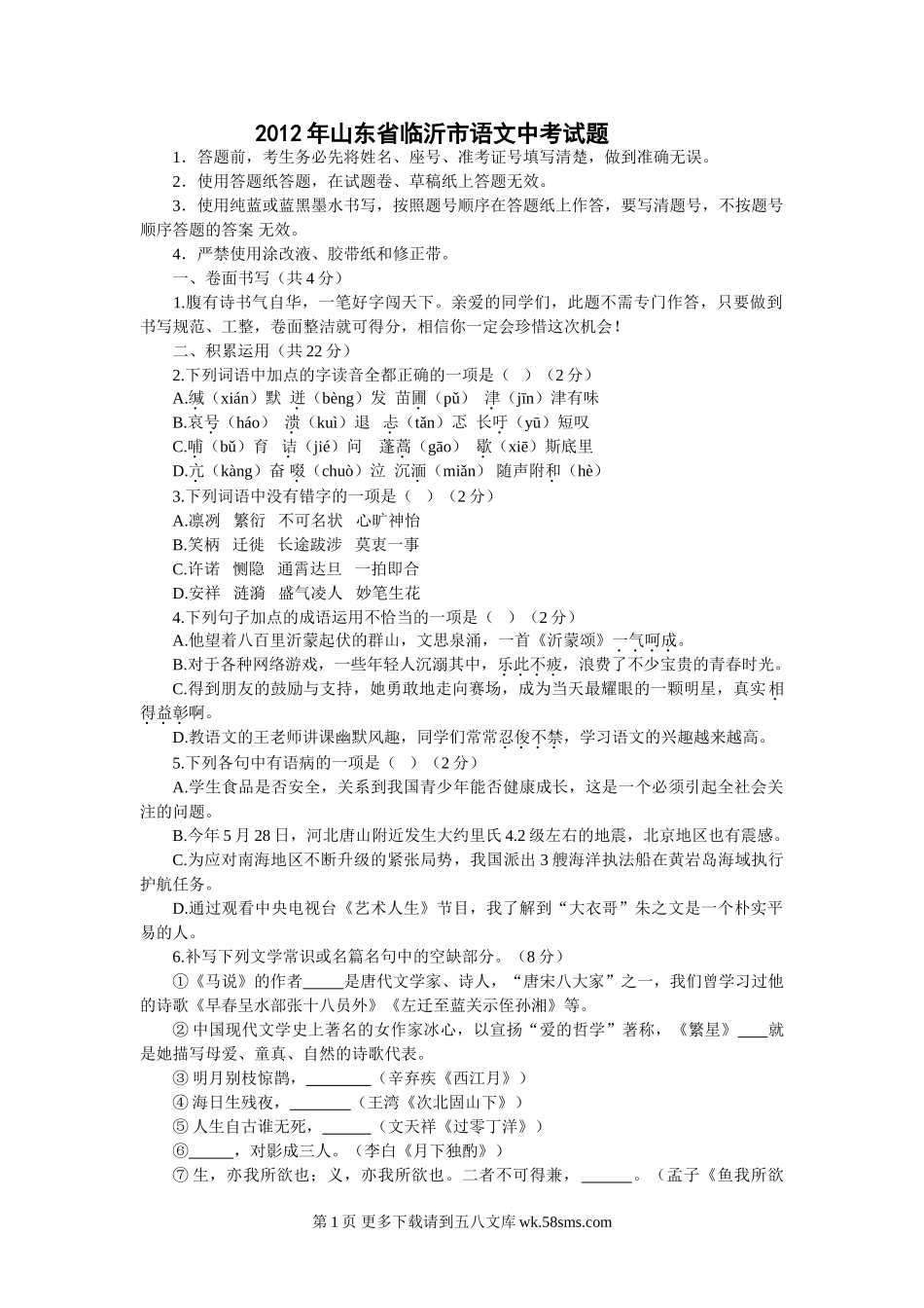 2012年山东省临沂市语文中考试题1.答题前,考生务必先将姓名、座号、准考证号填写清楚,做到准确无误。2.使用答题纸答题,在试题卷、草稿纸上答题无效。3.使用纯蓝或蓝黑墨水书写,按照题号顺序在答题纸上作答...