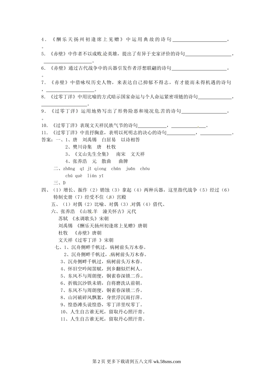 一.文学常识填空.1.《酬乐天扬州席上见赠》一诗的作者是朝的。诗题中的“乐天”是的字,“酬”这里的意思。2.《赤壁》选自,作者是(朝代)。3《过零丁洋》选自,作者是(朝代)。4.《山坡羊·潼关怀古》的作...