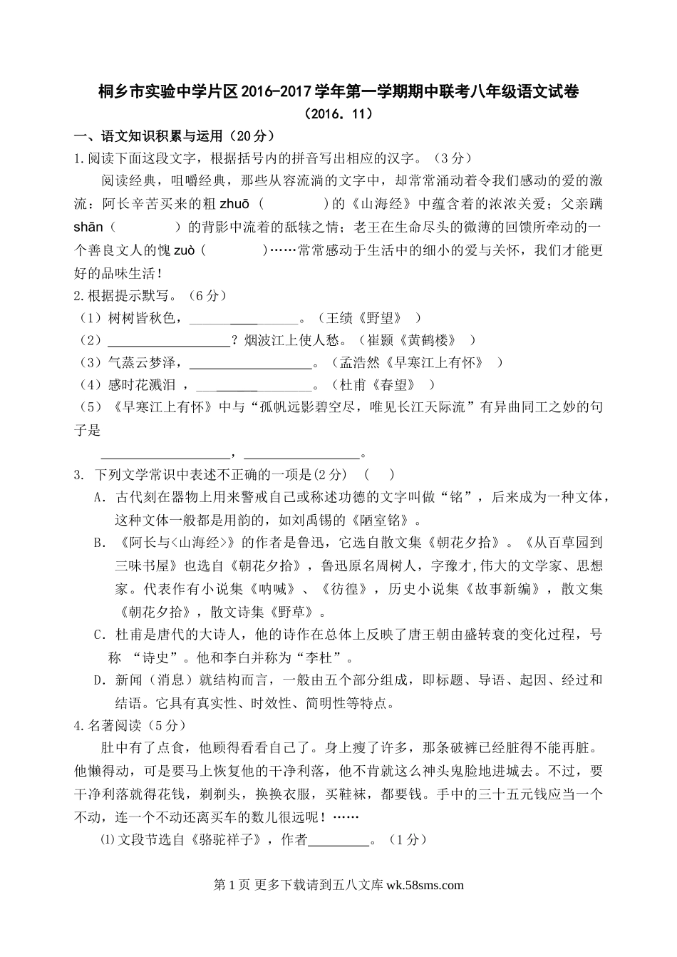 桐乡市2016-2017年第一学期八年级语文期中试卷及答案.doc