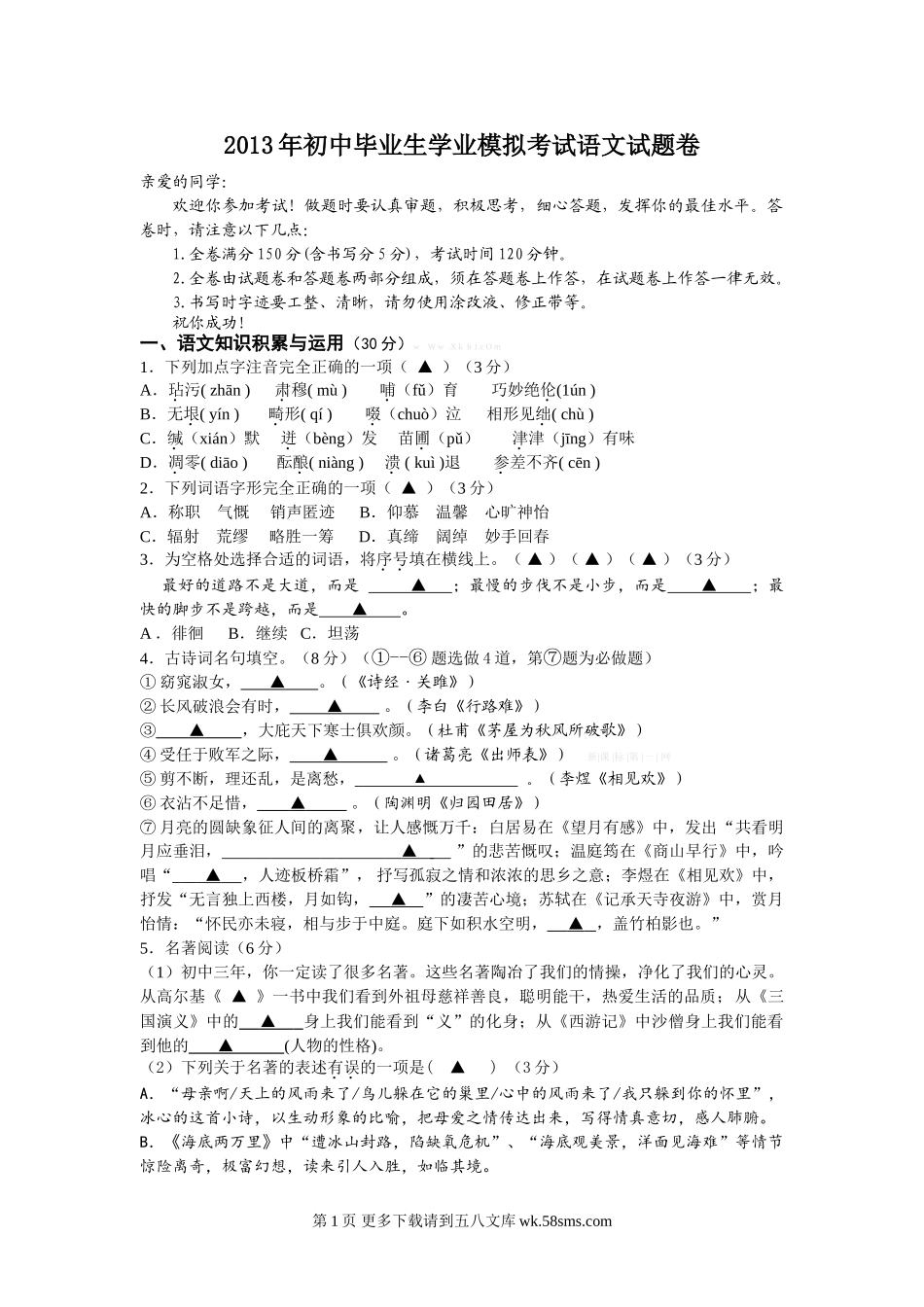 2013年初中毕业生学业模拟考试语文试题卷亲爱的同学:欢迎你参加考试!做题时要认真审题,积极思考,细心答题,发挥你的最佳水平。答卷时,请注意以下几点:1.全卷满分150分(含书写分5分),考试时间120分钟。2.全...
