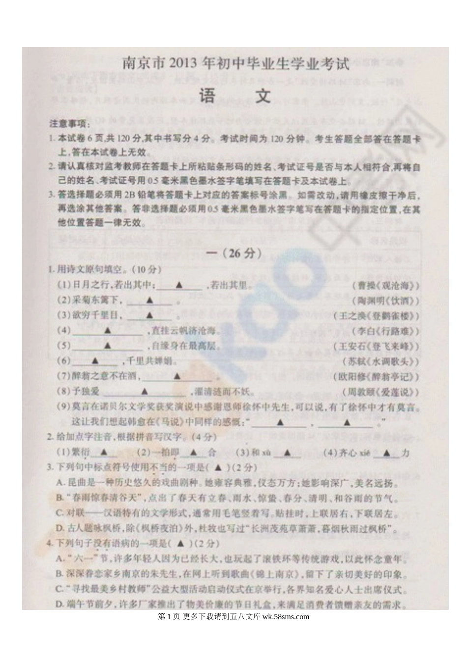 2013年南京市中考语文试题及答案.doc