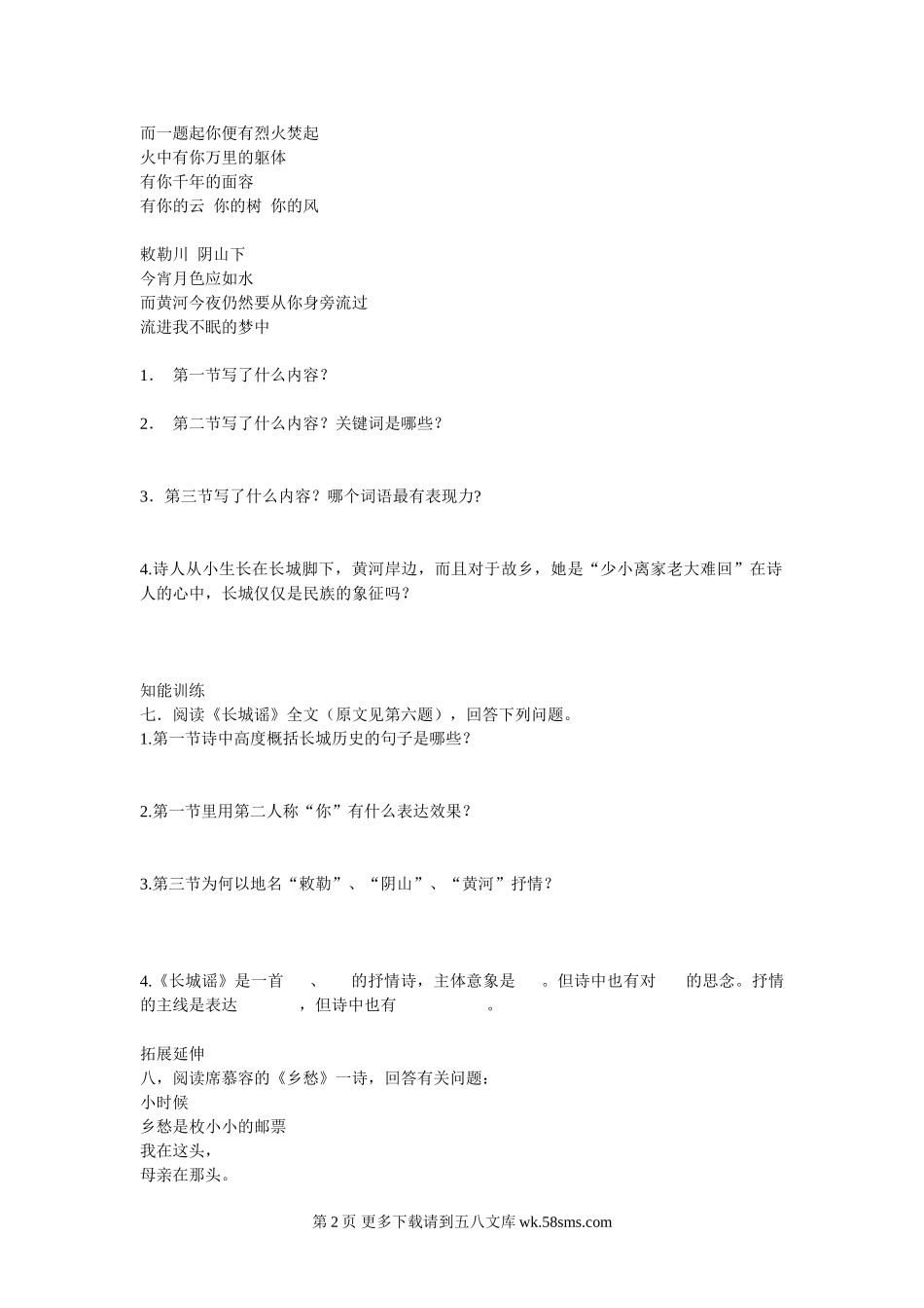 语文版《现代诗两首--长城谣、一片槐树叶》同步练习.doc_第2页