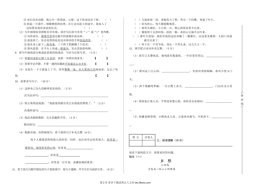 2014年呼和浩特市中考汉语文试卷及答案.doc_第2页